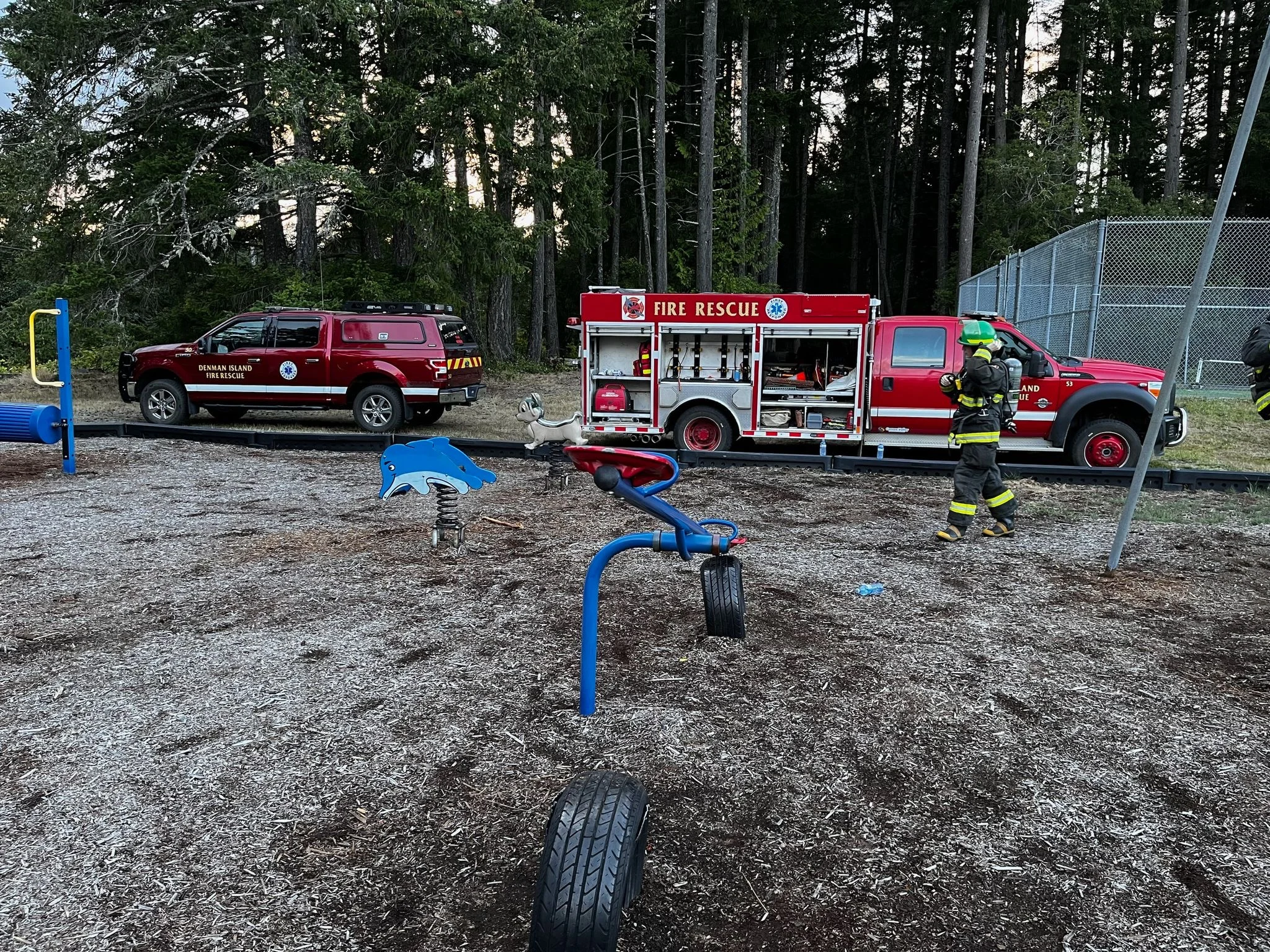 Rescue 53 is a four-wheel drive 2013 Ford 550 with a fire truck-chassis. It is equipped as a rescue and rapid attack vehicle. It carries first responder equipment and supplies, 500 feet of hose, 200 gallons of water with fire-suppressing foam capabilities, self-contained breathing apparatus, hydraulic cutters and spreaders for motor vehicle incident rescues and gear for incline rescues.