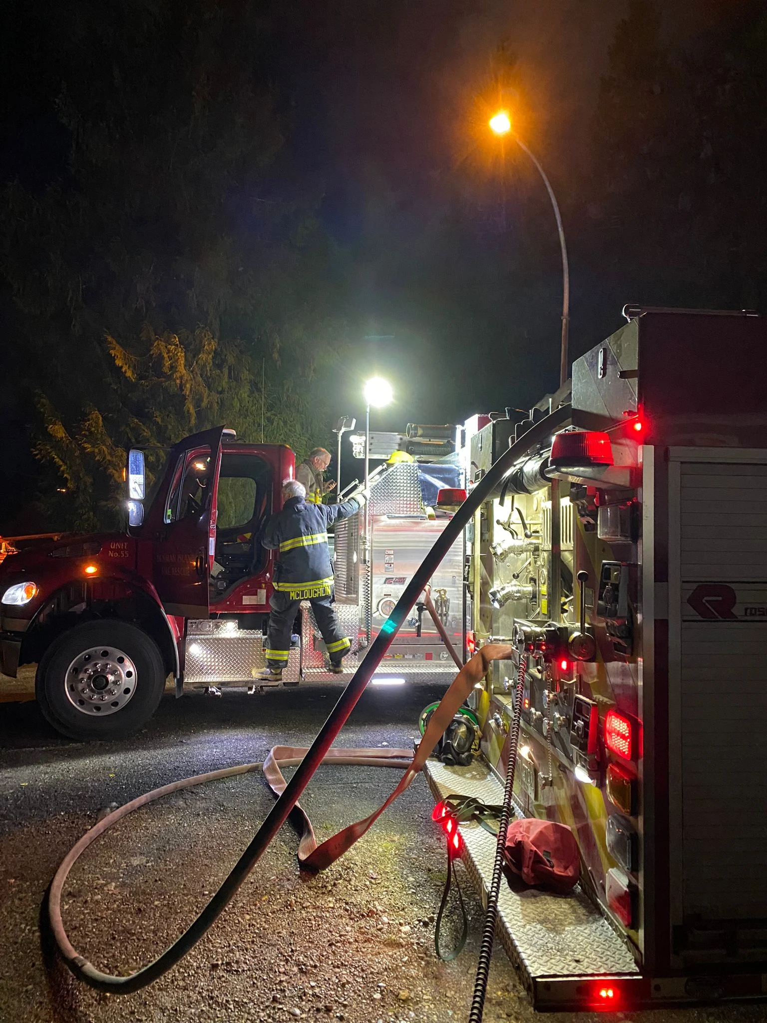 -Engine 55 is a year 2024 Fort Garry pumper on a Freightliner chassis, and is the Fire Department’s main vehicle for pumping water at structural fires or wildfires. It is equipped with a variety of ladders, self-contained breathing apparatus and over 2000 feet of hose and its powerful on-board pump can deliver water for firefighting through multiple hose connections as well as a high volume water cannon. It carries 750 gallons of water on board with which to quickly begin knocking down a fire and is capable of generating fire-suppressing foam, which extends the firefighting capacity of the water by 8-10 times. For major fires it pumps water from portable tanks filled by our fleet of tanker trucks. It carries a crew of three.